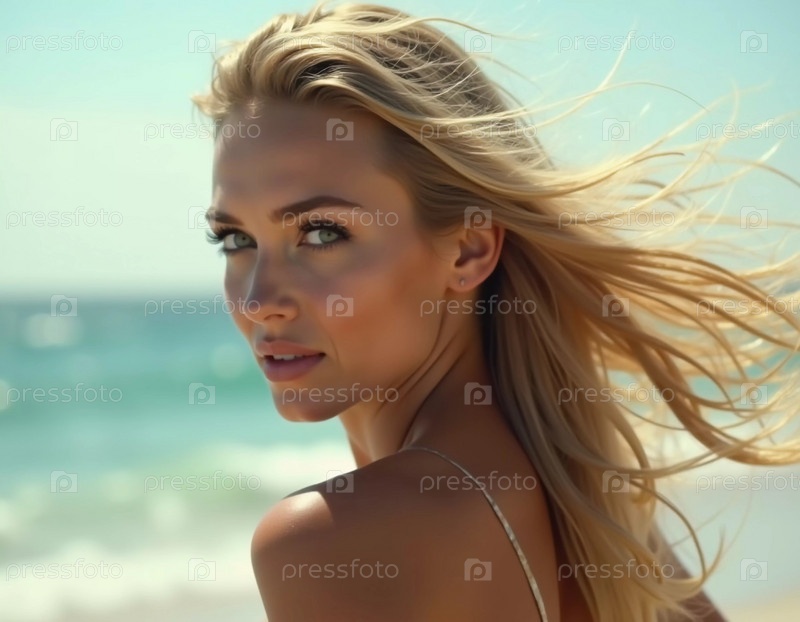 Блондинка в купальнике смотрит назад, стоя рядом с береговой линией.Нежные морские волны обнимают ее у ног под чистым голубым небом.Длинные волосы, красивое молодое лицо.Путешествия и реклама одежды