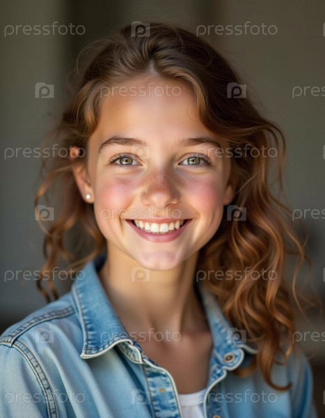 Молодая белая девушка с красивыми глазами и волнистыми волосами стоит, мягко улыбаясь.Ее игривое поведение просветляется, когда она позирует в уютном помещении во Франции.Генеративный ИИ