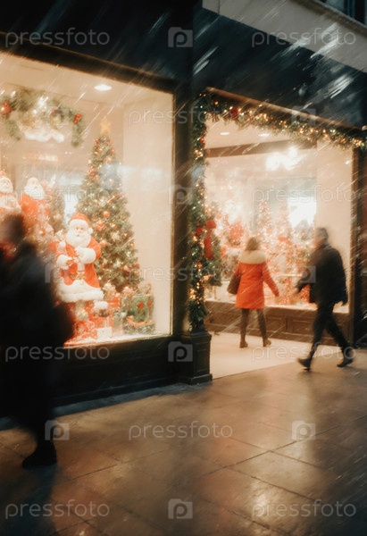 Декорации Санта-Клауса заполняют витрину магазина, когда люди прогуливаются мимо, наслаждаясь праздничной атмосферой во время подготовки к празднованию Рождества и Нового года