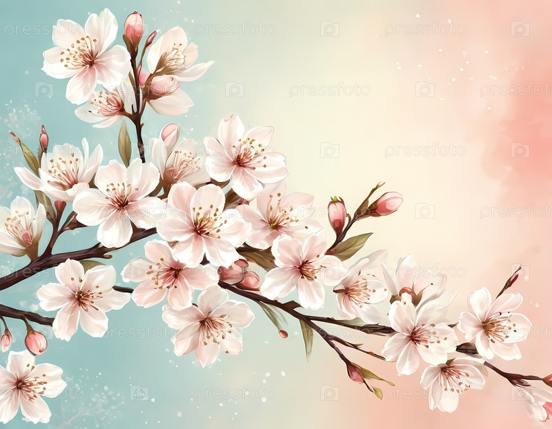 Красивая ветвь вишневых цветов расцветает, украшенная мягкими розовыми и белыми листьями.Нежные оттенки фона создают спокойную атмосферу весеннего обновления Generative AI