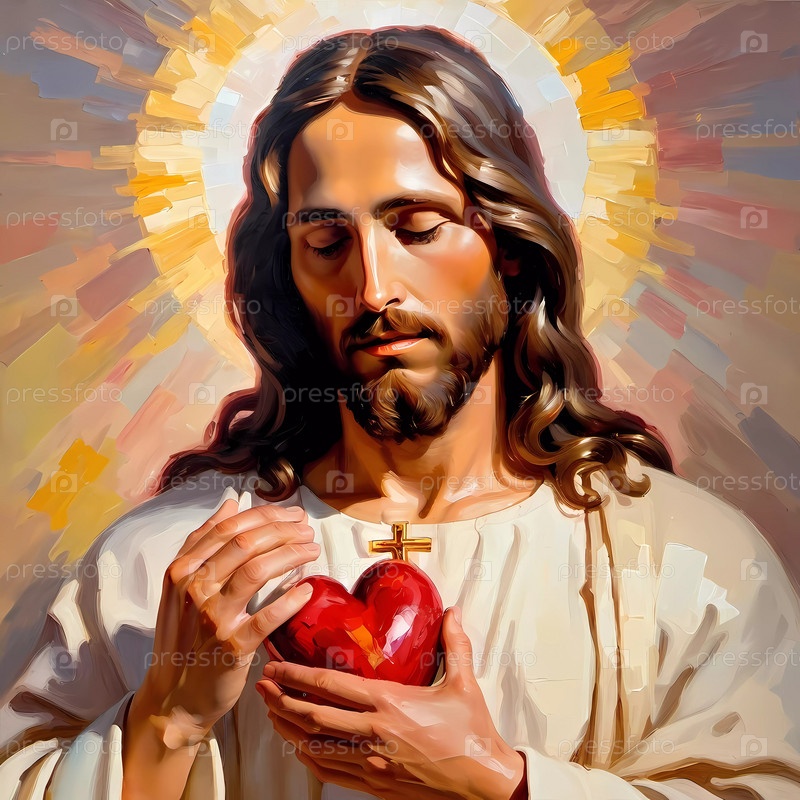 Иисус держит свое священное сердце, излучающее божественный свет, окруженное золотыми оттенками, символизирующими любовь и сострадание, демонстрируя свое послание надежды и спасения для человечества