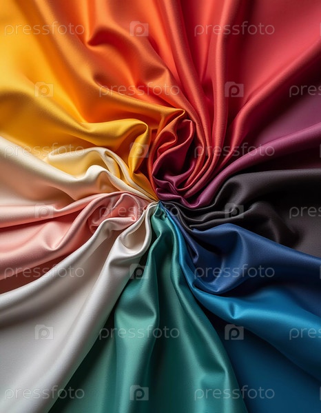 Потрясающий ассортимент шелковой ткани демонстрирует богатый спектр цветов, изящно расположенных в текущей спирали, приглашая к тактильному исследованию и художественному вдохновению
