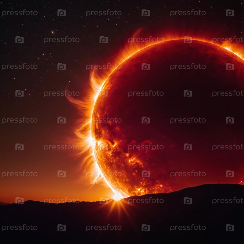 Потрясающий космический дисплей показывает, как солнце опускается под далекие холмы, окутанное огненным светом, которое зажигает ночное небо яркими цветами и звезды мигают в гармонии