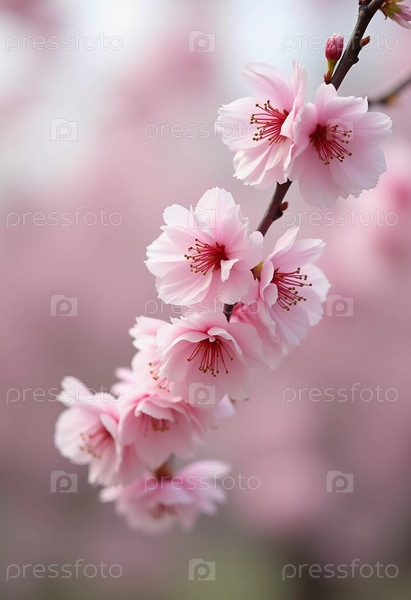 Нежные розовые вишневые цветки красиво цветут на ветке дерева во время весеннего сезона, заполняя сцену яркими цветами и ощущением обновления в природе