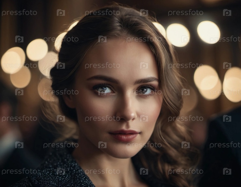 Излучая обаяние и изысканность, потрясающая русская женщина очаровывает присутствующих на элегантном вечернем собрании, ее яркие черты подчеркиваются теплыми, приглашающими огнями Generative AI