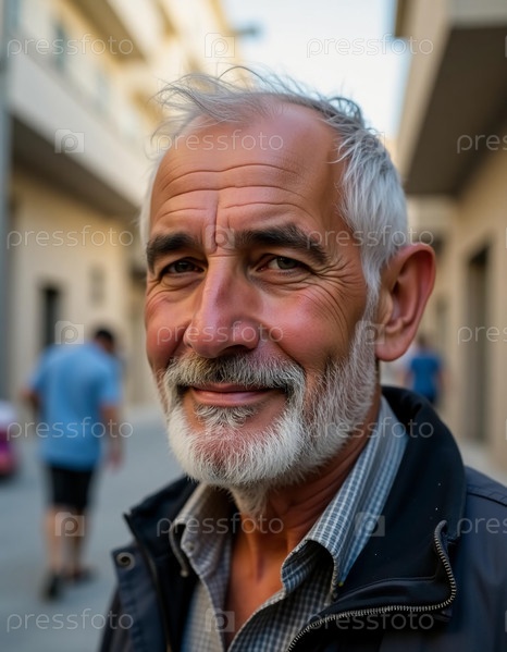 Выдающийся пожилой человек уверенно стоит на улицах Газы, его изношенная, но теплая улыбка отражает всю жизнь переживаний и историй среди шумной жизни вокруг него