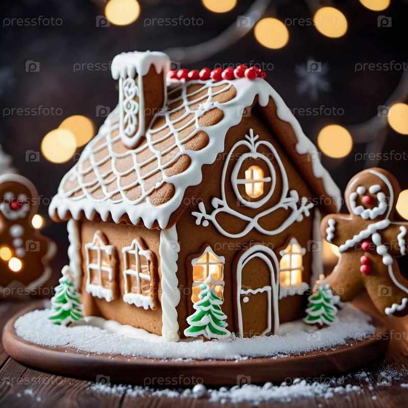 На тарелке выделяется праздничный дом с имбирем, украшенный мороженым, конфетами и снежными декорациями.Он отражает дух рождественской выпечки в атмосфере веселья.Генеративная ИИ
