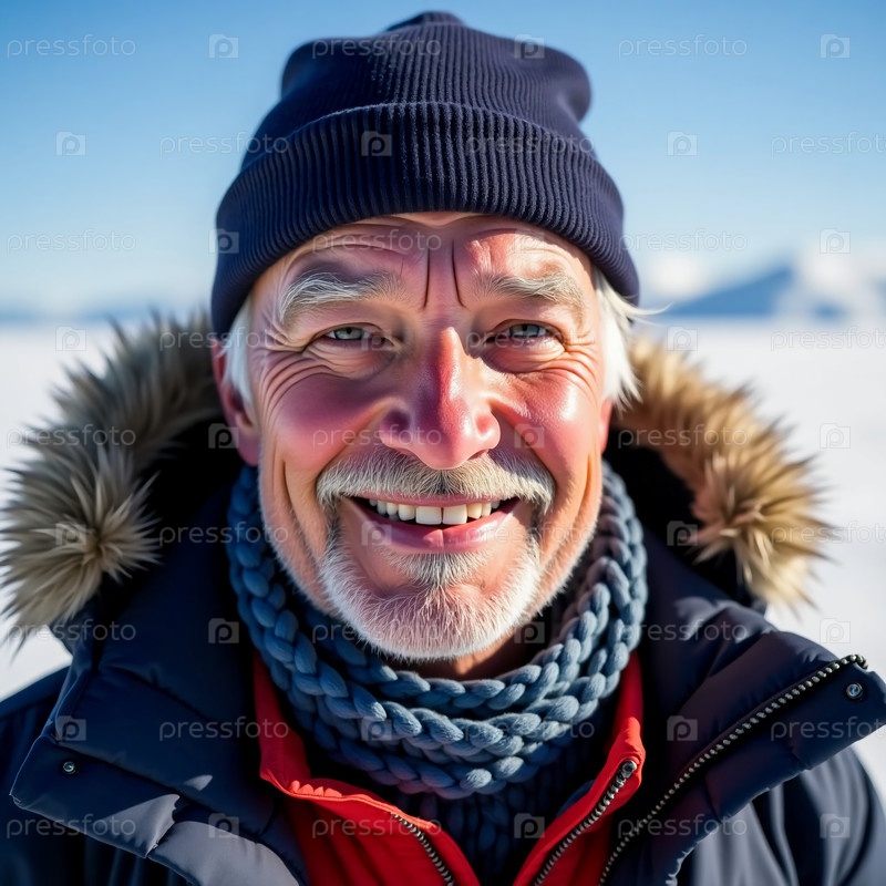 Веселый пожилой мужчина стоит на фоне потрясающих заснеженных вершин, ярко улыбается и тепло одет в уютный зимний костюм Generative AI