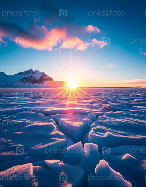 Спокойный арктический ландшафт тундры покрыт морозом при восходе солнца, излучая золотистый свет над ледяной местностью и освещая тонкие образования льда
