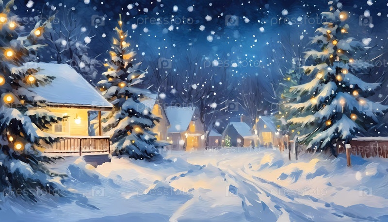 В спокойную снежную ночь мягкие боке-рождественские огни украшают еловые ветви среди живописного пейзажа. Видны уютные дома, излучающие тепло и празднование в стране зимних чудес