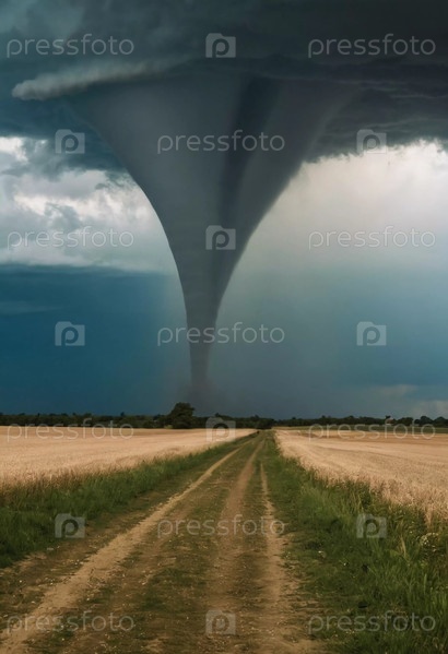 Мощный торнадо спускается из темных облаков, вращаясь интенсивно посреди спокойного сельского поля.Заходящее солнце блестит теплым светом, улучшая драматическую атмосферу.Генеративный ИИ