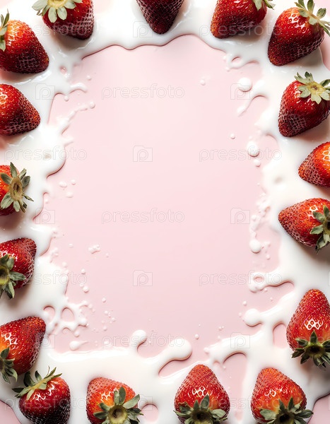 Ярко-розовый йогурт изящно обрамлен яркими клубниками и сливочными брызгами, приглашая на вкус свежести и радости в солнечный день Generative AI