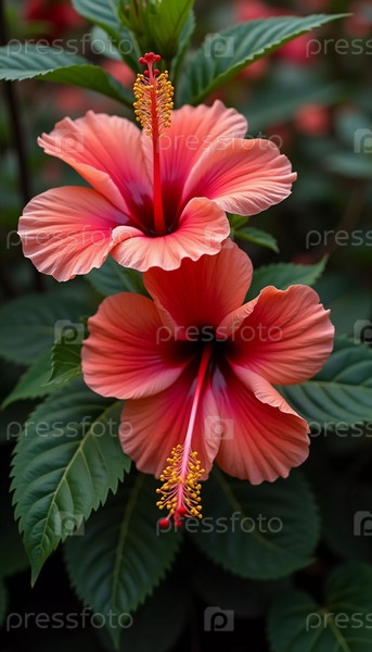 Ярко-красные цветы гибискуса демонстрируют сложные лепестки в процветающем саду. пышная зелень создает яркий фон для их красоты