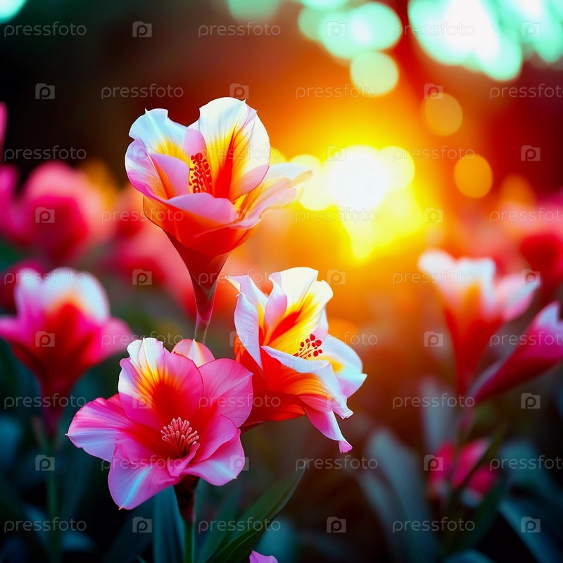 Кластеры потрясающих мечлилий демонстрируют свои яркие розовые, персиковые и сливочные лепестки, привлекая опылителей в спокойной садовой обстановке при мягком свете рассвета