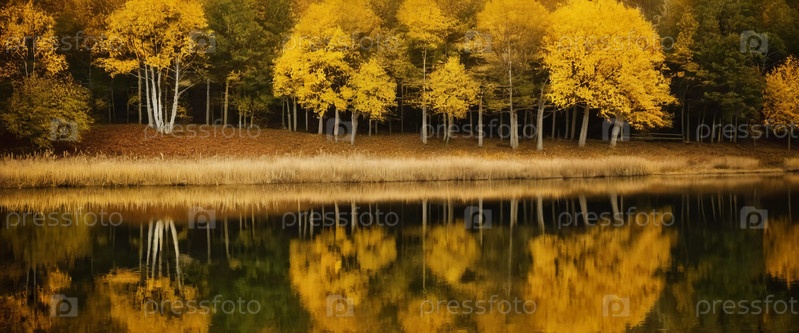 Вибрирующие желтые листья создают потрясающий осенний дисплей вокруг спокойного озера с отражениями, отражающими листву на поверхности воды по мере того как день подходит к концу