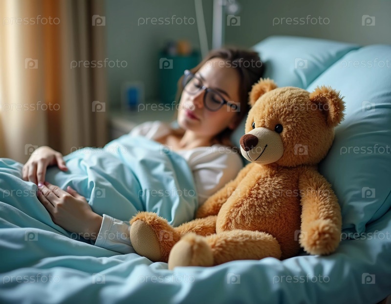 Женщина отдыхает в больничной кровати, уютная под мягкими простынями с плюшевым медведем рядом.Ее закрытые глаза передают момент покоя среди невзгод, подчеркивая стойкость и комфорт