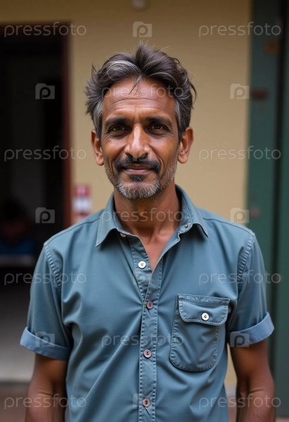 Улыбающийся мужчина-житель Индии уверенно стоит, одетый в непринужденную рубашку с коротким рукавом, окруженный приглашающей городской атмосферой