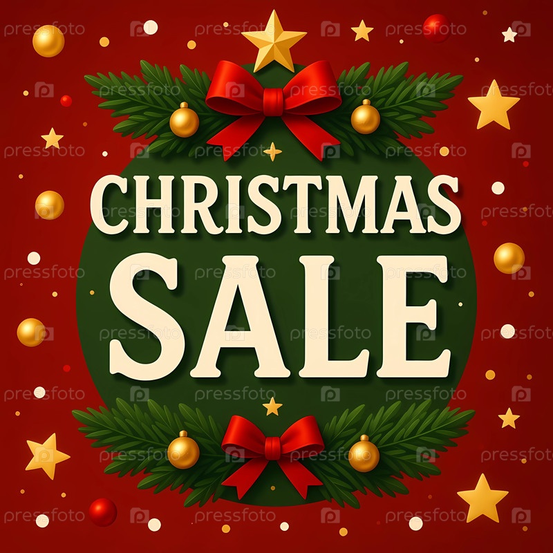 Баннер рождественской распродажи показывает зеленый круг со словами Рождественская распродажа большими буквами. на красном фоне изображены звезды, орнаменты и ленты для праздничного дизайна Generative AI