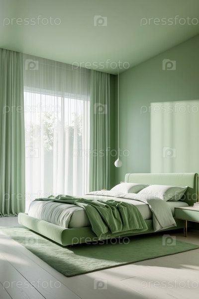ИИ генеративный современный уютный интерьер спальня квартира комната зеленый цвет, комфортный дизайн дома