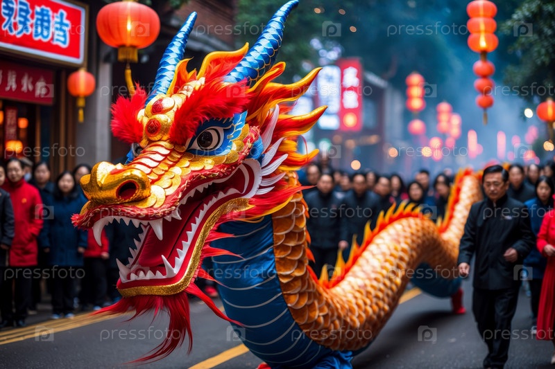 Люди празднуют китайский Новый год, мужчины и женщины в традиционных костюмах на параде в Китае