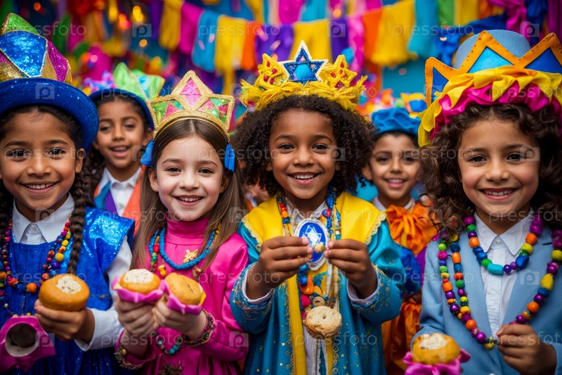 ИИ генеративные еврейские дети в карнавальных костюмах, празднующие традиционный еврейский праздник Пурим в Израиле