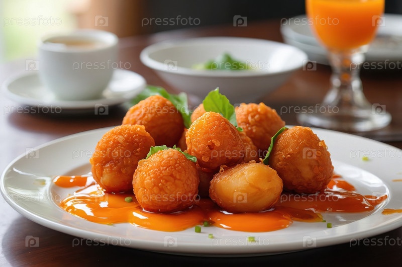Филиппинская уличная закуска Kwek Kwek, куриное яйцо в тесто с хрустящей корой и пряным соусом AI Generative