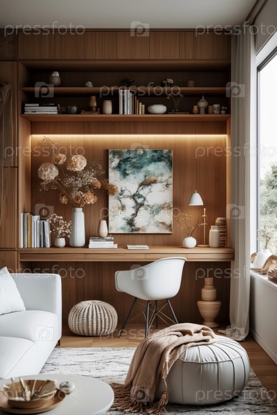 AI генеративный современный уютный интерьер гостиной бежевая деревянная мебель комфортабельный дизайн дома