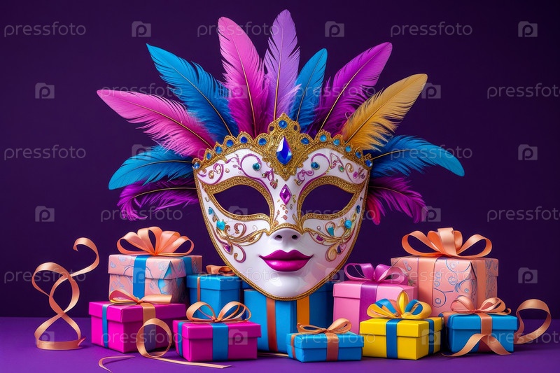 Красочные карнавальные маски, празднование еврейских традиций Фестиваль Пурима Парад фоновый AI генеративный