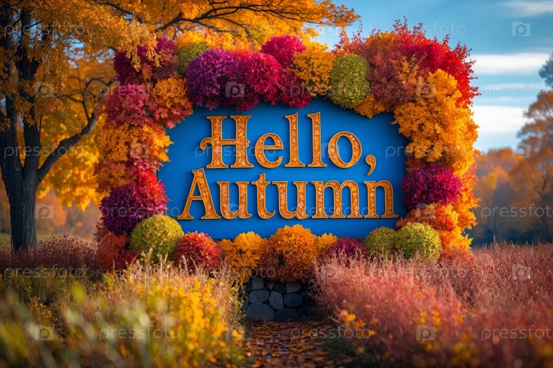 Надпись на поздравительной карточке Здравствуйте осень Осенний фон желтый и красный листья листок падение AI Generative