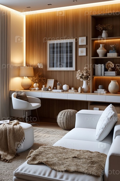Уютный интерьер Гостиная бежевый деревянный цвет мебели Комфортный дизайн современного дома AI Generative