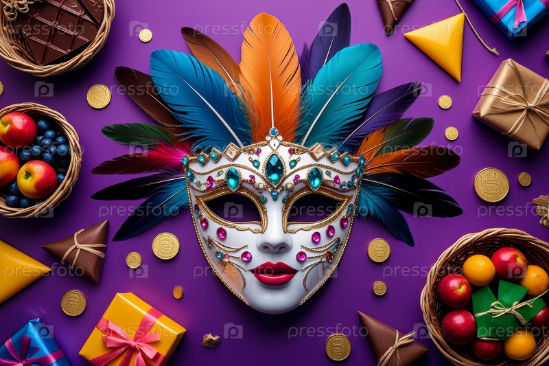 Красочные карнавальные маски, празднование еврейских традиций Фестиваль Пурима Парад фоновый AI генеративный