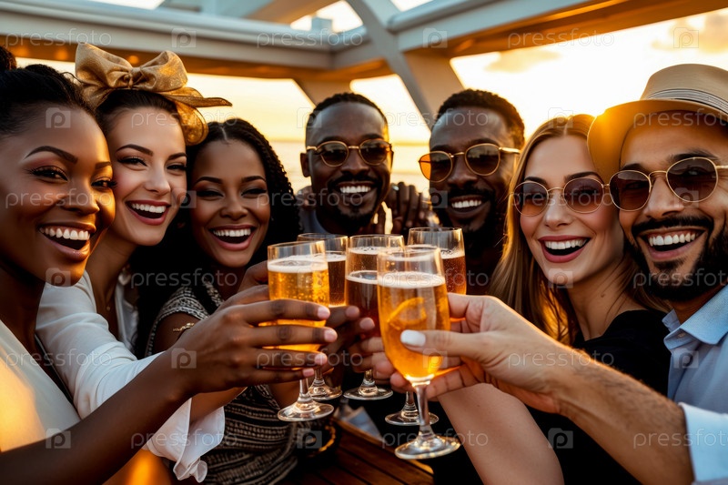 Большая группа друзей выпивает стакан пива и алкогольный коктейль на яхте в отпуске AI Generative