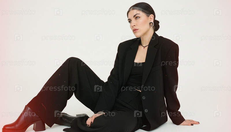 Модель сидит на полу в черном костюме в студии на циклораме