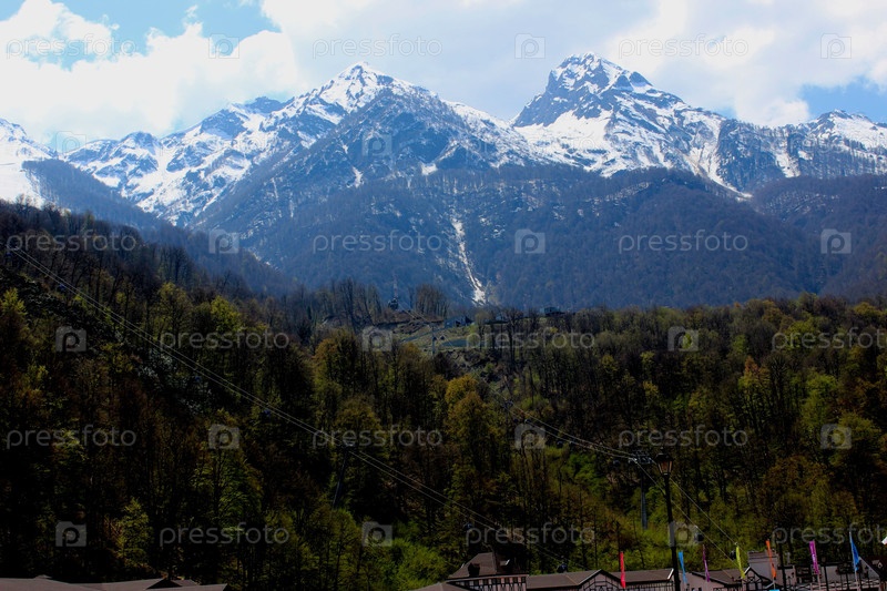 Горы, покрытые зеленым лесом на фоне заснеженных пиков гор в марте