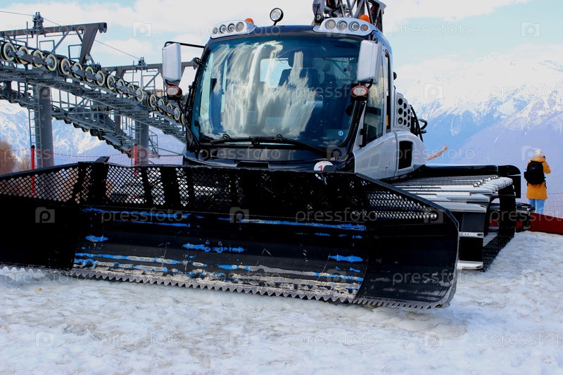 Снегоуборочный бульдозер отдыхает после очистки склонов гор для лыжных трасс