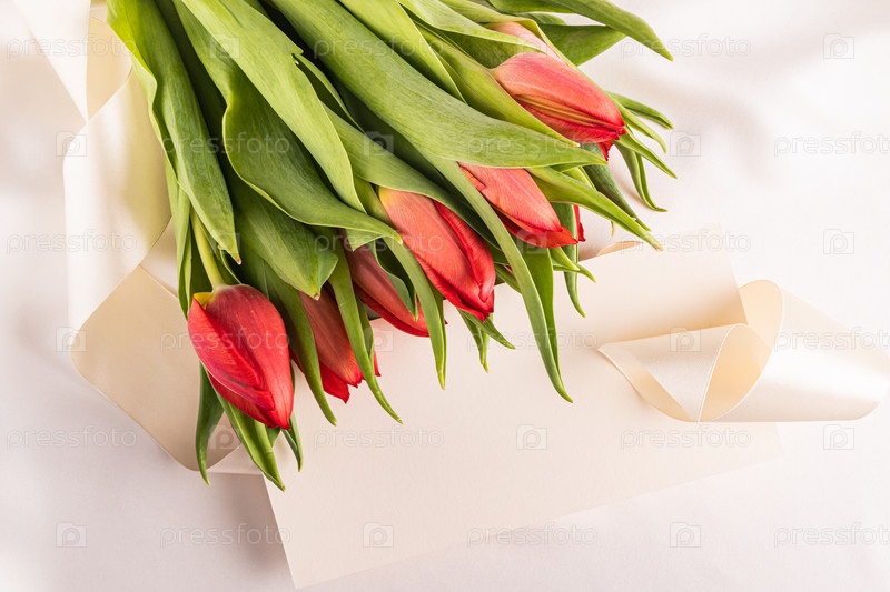 Шикарный букет красных тюльпанов с бежевой атласной лентой и конверт с пустым пространством для текста на бежевом атласном фоне. верхний вид