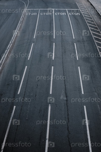Дорожная разметка с надписями «СТОП» на многополосном асфальтовом шоссе сверху