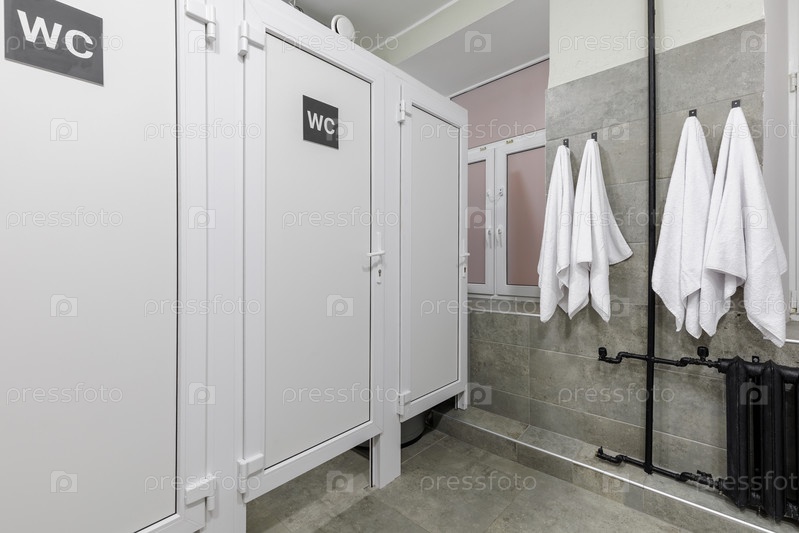 Чистая, современная общая ванная комната в общежитии с несколькими белыми дверями для частных туалетных киосков, серые плитки на стенах с эффектом камня и свежие белые полотенца, висящие на стенных крюках рядом с черным радиатором