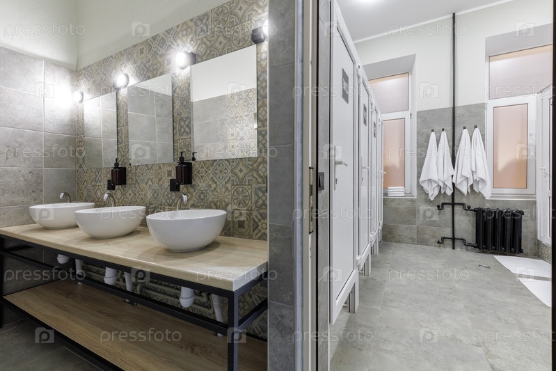 Просторная и чистая ванная комната хостела с тремя белыми раковинами для сосудов на деревянной столешнице с большими зеркалами, рядом с рядом частных белых душевых или туалетных стенд и свежими белыми полотенцами, висящими на стойке