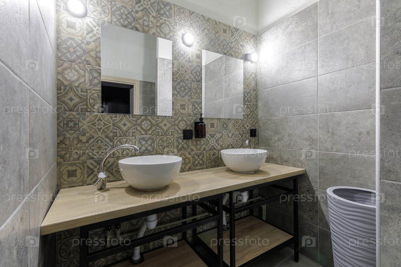 Ванная комната хостела с двойными раковинами для судов и современными плитками с узорами