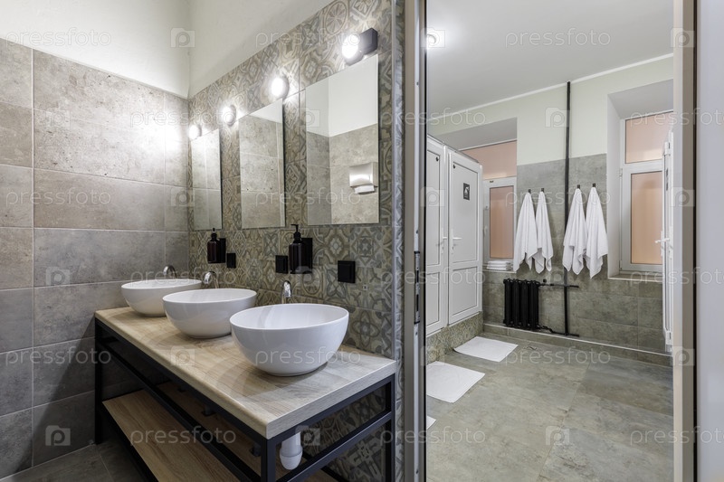 Широкоугольный интерьерный снимок чистой, современной общей ванной комнаты в хостеле с тремя белыми раковинами для сосудов на деревянном ваните, большими зеркалами с яркими огнями и видом на отдельную зону с белыми туалетными стойками и свежими полотенцам