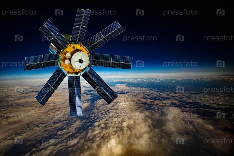 Детальный вид спутника в космосе с металлической структурой, антеннами и большими солнечными панелями на орбите над голубой атмосферой Земли и оранжевыми облаками против темной пустоты