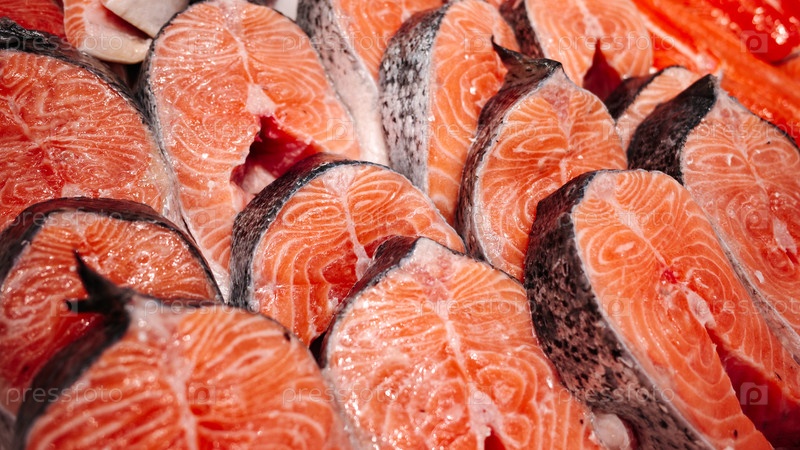 На выставке свежие сырые стейки лосося, ярко-оранжевое рыбное мясо с мраморной текстурой и кожей, готовые к приготовлению пищи, фоне рынка морепродуктов