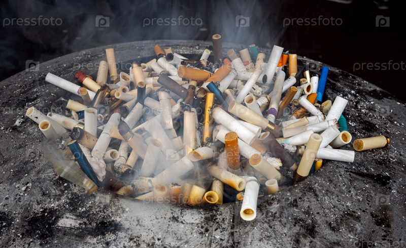 Переполненная пепельница, набитая сигаретными дубинками и дымом