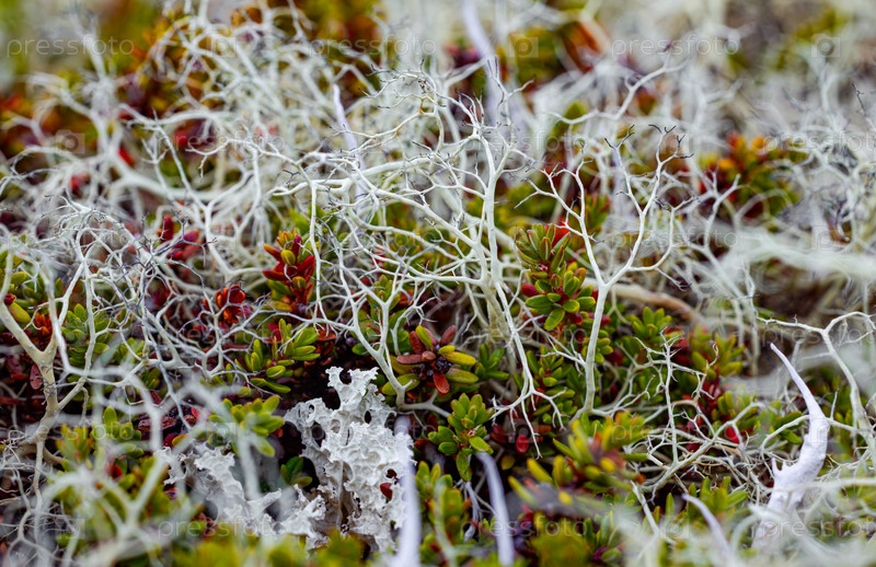 Яркий естественный рисунок моха и небольших сочных растений с белыми сухими ветвями. Красочные тундровые лишайники и ягоды