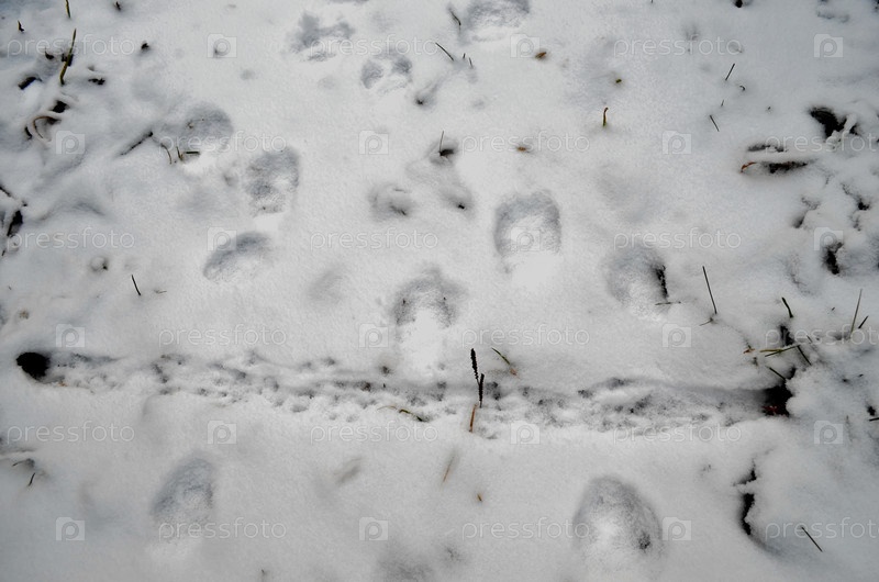 Следы на снегу лисицы и тропа мелких грызунов - мышей