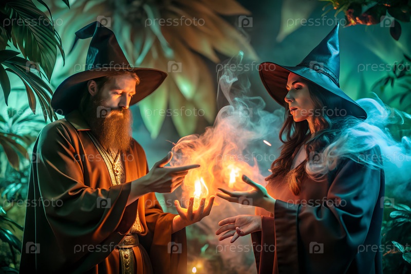 Фантастические волшебники сражаются со светящимися магическими заклинаниями на пейзаже туманных холмов, силуэтами в мистической атмосфере