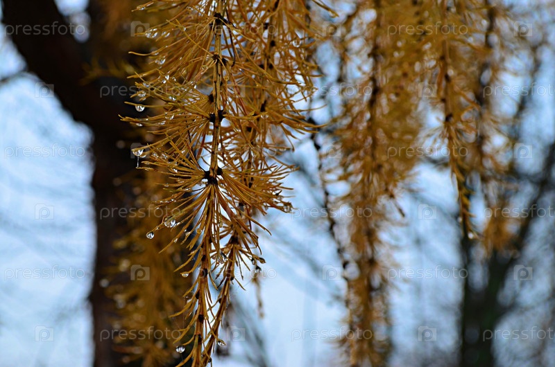 Ветки лиственницы осенью после дождя, крупный план. Капли на хвое