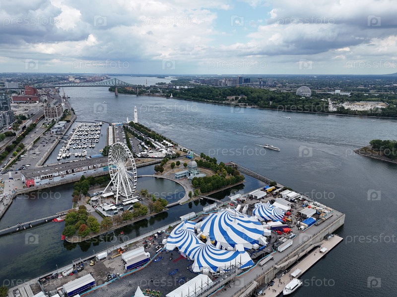 24 августа 2025 года полет беспилотника над голубо-белой палаткой в Старом порту Монреаля с горизонтом города на заднем плане