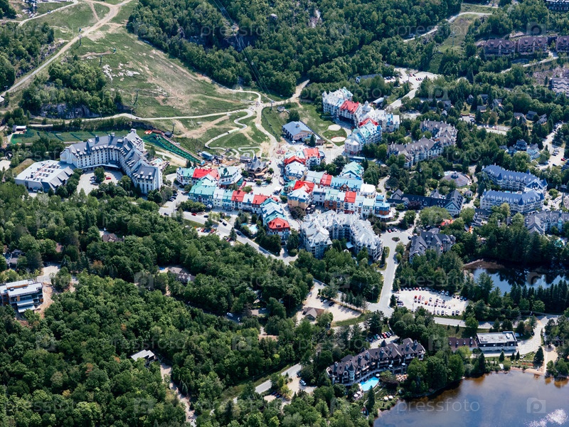 Вид с воздуха курортной деревни Монт-Тремблан, Квебек, Канада с озером, лесом и горным пейзажем летом
